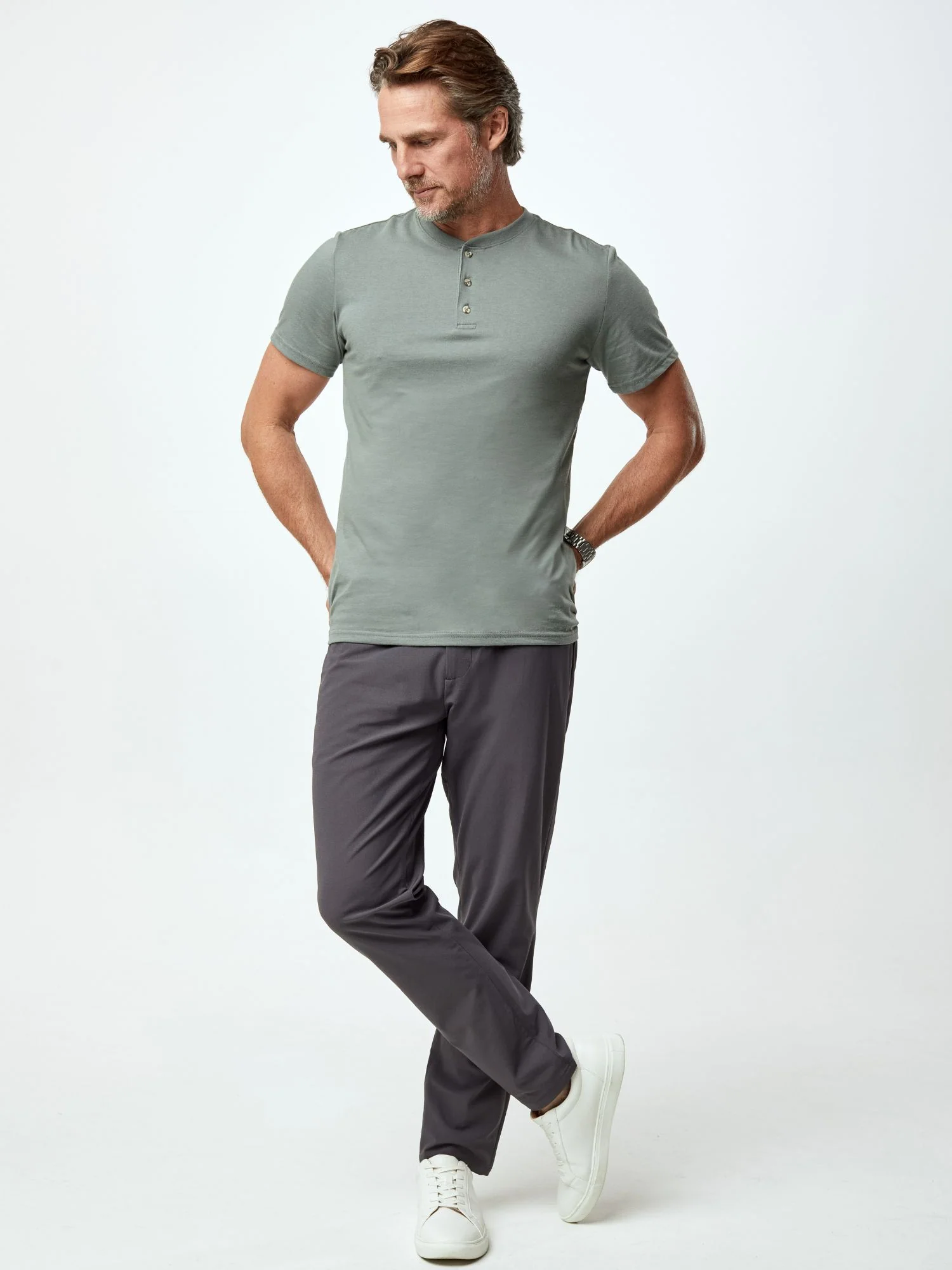 We took green a bit further (and darker) with our Mercury Green Short Sleeve Henley. Its greyish-green coloring gives it a uniquely muted palette. Pair that with its dapper button placket and its durable stitching, and you’ve got a look you can rely on.